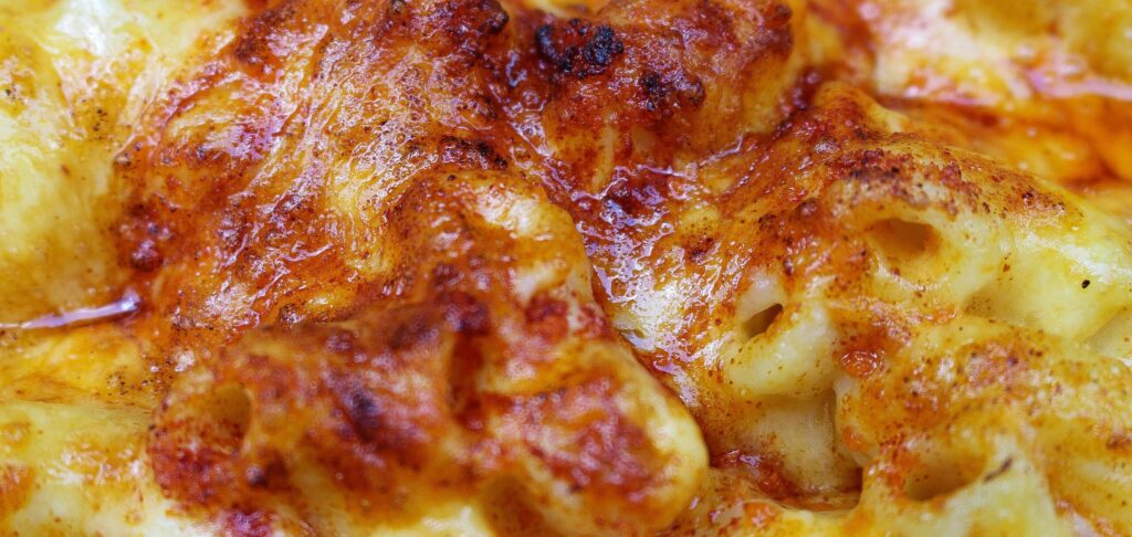 Macaroni with cheese, cheese and more cheese. Topped with smoked paprika breadcrumbs